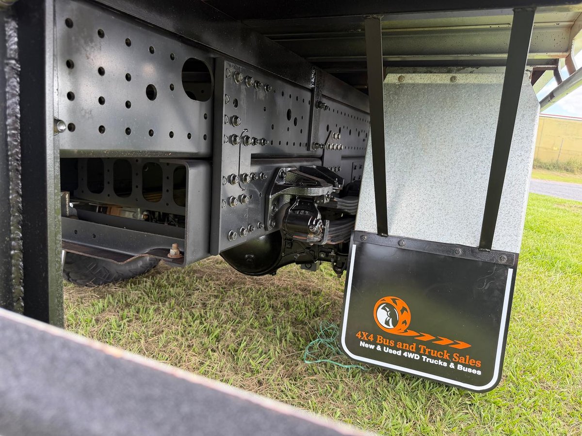 GVM 7400kg, GCM 11000kg, LR Licence, High / Low Range, New front and rear heavy duty Oztec long travel shocks, New Super single Alloy 17ich 35x12.5r17 RT, or Steel 285/70R19.5 tyre options. Alloy winch compatible bull bar.